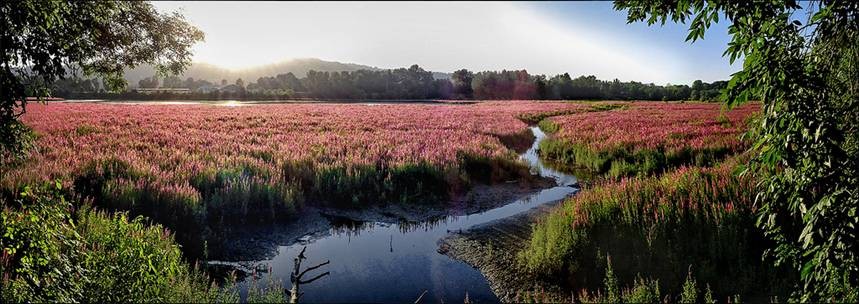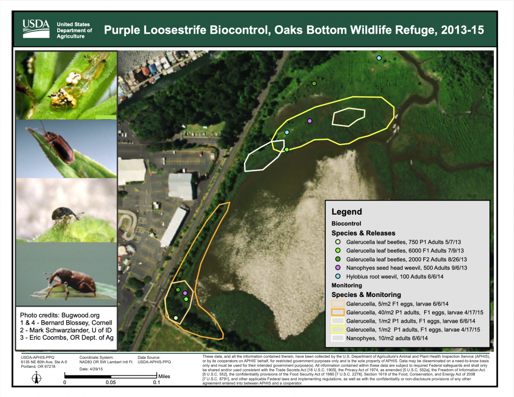 2008: PP&R’s Mark Wilson, in consultation with Marc Peters of the Bureau of Environmental Services, enlists the services of the USDA Animal Plant Health Inspection Service (APHIS), and the Oregon Department of Agriculture (ODA), to release three species of beetles as a biocontrol agent to reduce the flourishing population of purple loosestrife (Lythrum salicaria). However, the natural hydrology of the Bottom is still affected by the use of the weir, so the beetles are not able to do their job. Releases of these biocontrol agents continued for several more years through 2014 in hopes the beetle population would increase and have an impact on the purple loosestrife.