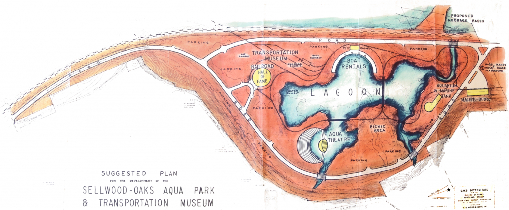 1959: The City of Portland acquires most of what is now the Oaks Bottom Wildlife Refuge (115 acres) in a land swap with PGE. The city council names it “Oaks Pioneer Park.” Commissioner Ormond R. Bean advances a 13-point program for development of the site, including a transportation museum, reproductions of historical buildings and pioneer towns, exhibits about lumbering, farming, and fishing, and “aquatic recreation facilities.”